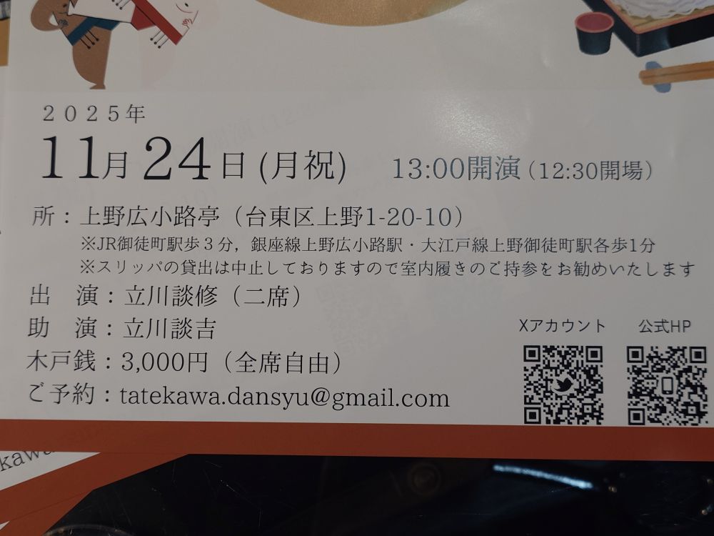 ご予約・お問合せ: tatekawa.dansyu@gmail.com (立川談修)