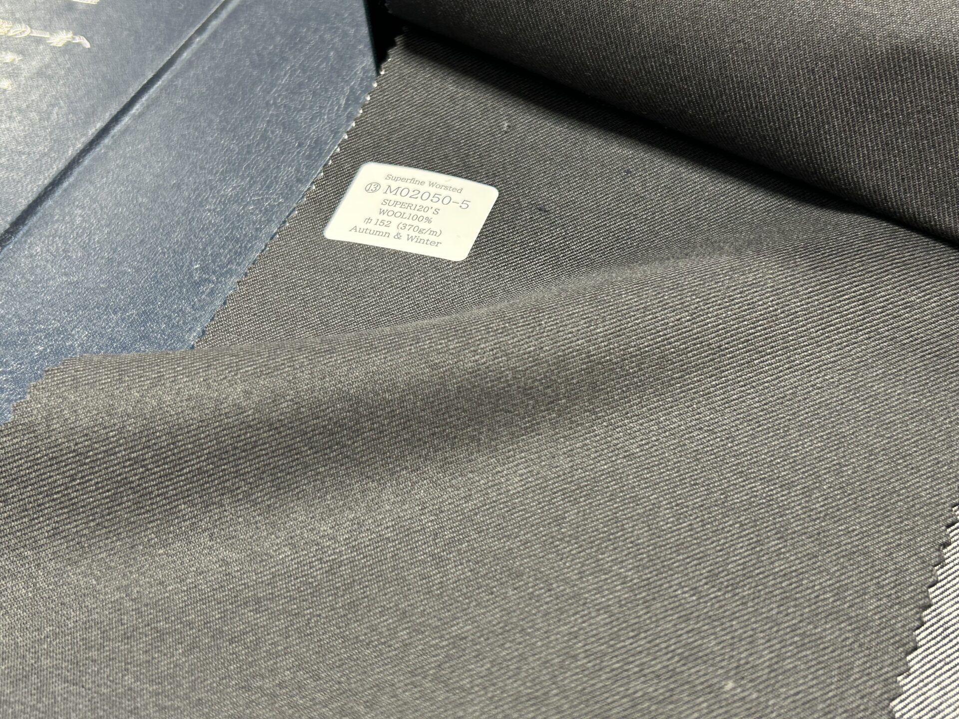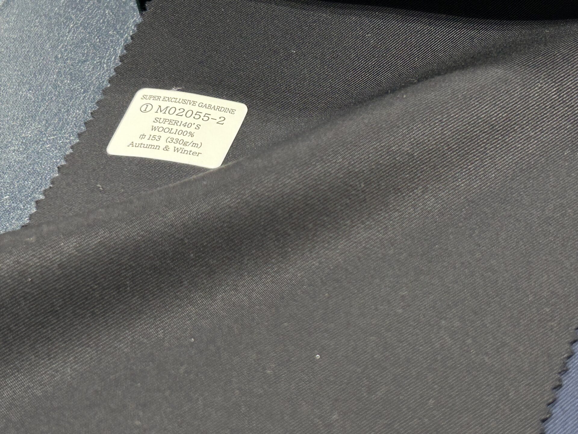 当バンチ最初に出てくる生地は当バンチの顔といっても差し支えありません。ミッドナイトネイビーの美しい生地でございます。ここでご注目いただきたいのが※「SUPER140s」「330g/m」「ギャバジン織」でございます。