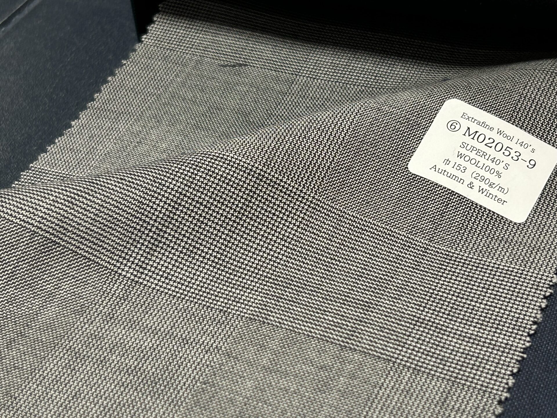 打って変わって290g/mのクラシカルなグレンチェック。その柄から主に秋冬物としてよりヘビーな生地感で作られる生地はよく見ますが、この原料の細さとクリアなタッチのクラシカルなグレンチェックは却って新鮮に映るかもかもしれません。