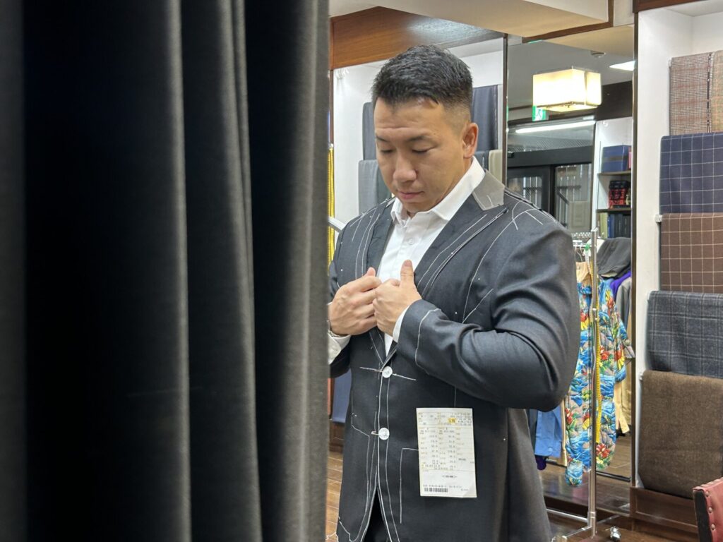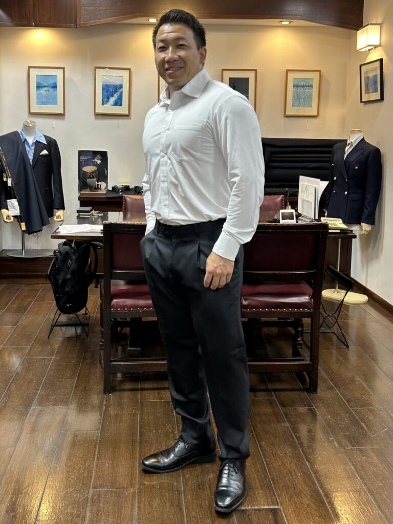 日の丸を背負い戦うアスリートの身体はこんなにも大きいのかと驚かされました。テーラー目線で申し上げますとこれほどの仕立て甲斐は他にありません。仕上がりも良くサイズ感も良好、とてもお似合いでした。